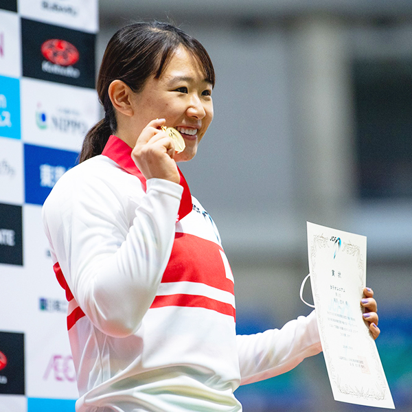 全日本選手権優勝メダルを掲げる梶原選手